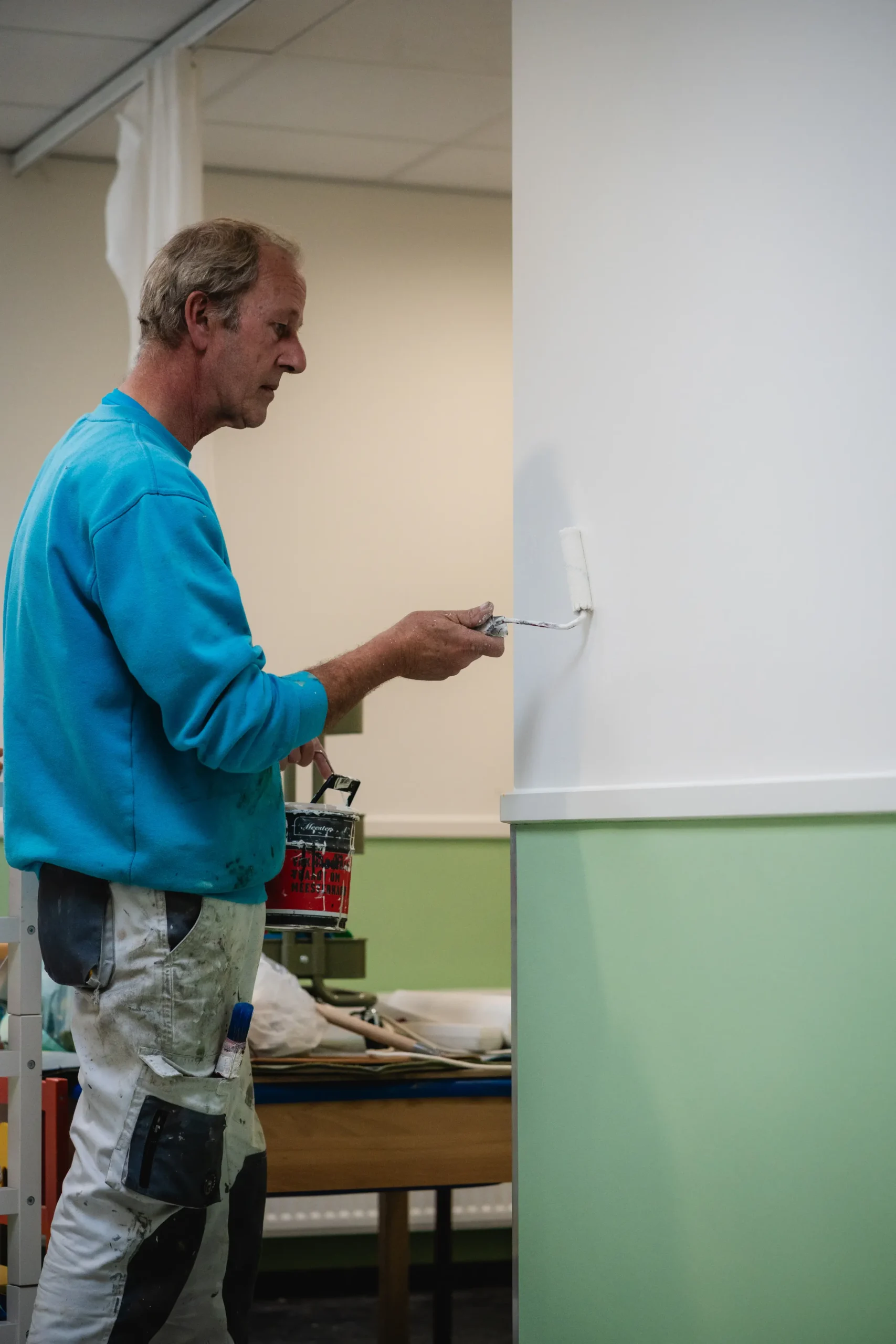 Voor dit project heeft Van Foeken Schilderwerken het binnenschilderwerk uitgevoerd in een kantoorpand. De werkzaamheden begonnen met een grondige inspectie van de bestaande verflagen en ondergronden, waarna deze zorgvuldig zijn voorbereid voor een nieuwe, strakke afwerking. Eventuele oneffenheden zijn hersteld om een egaal en professioneel resultaat te realiseren.